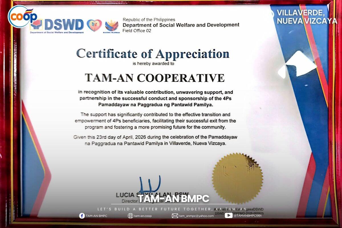 Our cooperative receives recognition from the 𝐃𝐞𝐩𝐚𝐫𝐭𝐦𝐞𝐧𝐭 𝐨𝐟 𝐒𝐨𝐜𝐢𝐚𝐥 𝐖𝐞𝐥𝐟𝐚𝐫𝐞 𝐚𝐧𝐝 𝐃𝐞𝐯𝐞𝐥𝐨𝐩𝐦𝐞𝐧𝐭 (𝐃𝐒𝐖𝐃) for its valuable contribution and unwavering support in the successful conduct and sponsorship of the 4Ps Pamaddayaw na Paggraduation ng Pantawid Pamilya.
